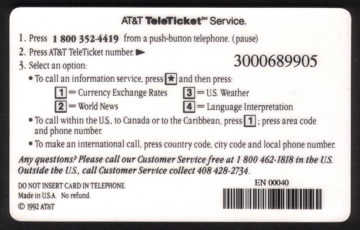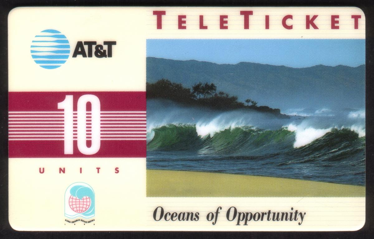 This AT&T Teleticket is a used phone card that provides prepaid calling units for telecommunications services. It bears visible smudges and scratches from prior use. The card’s layout is clean and balanced, integrating the ocean photographic image with corporate branding and numerical data for user reference.