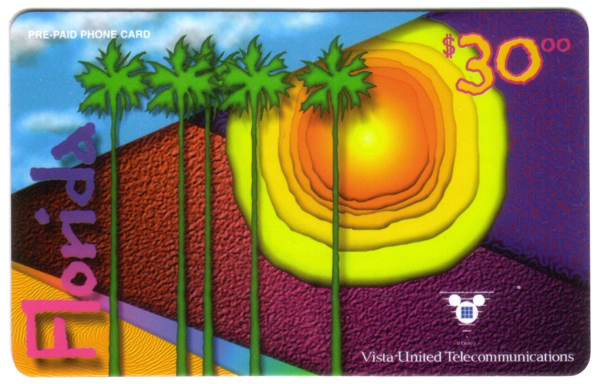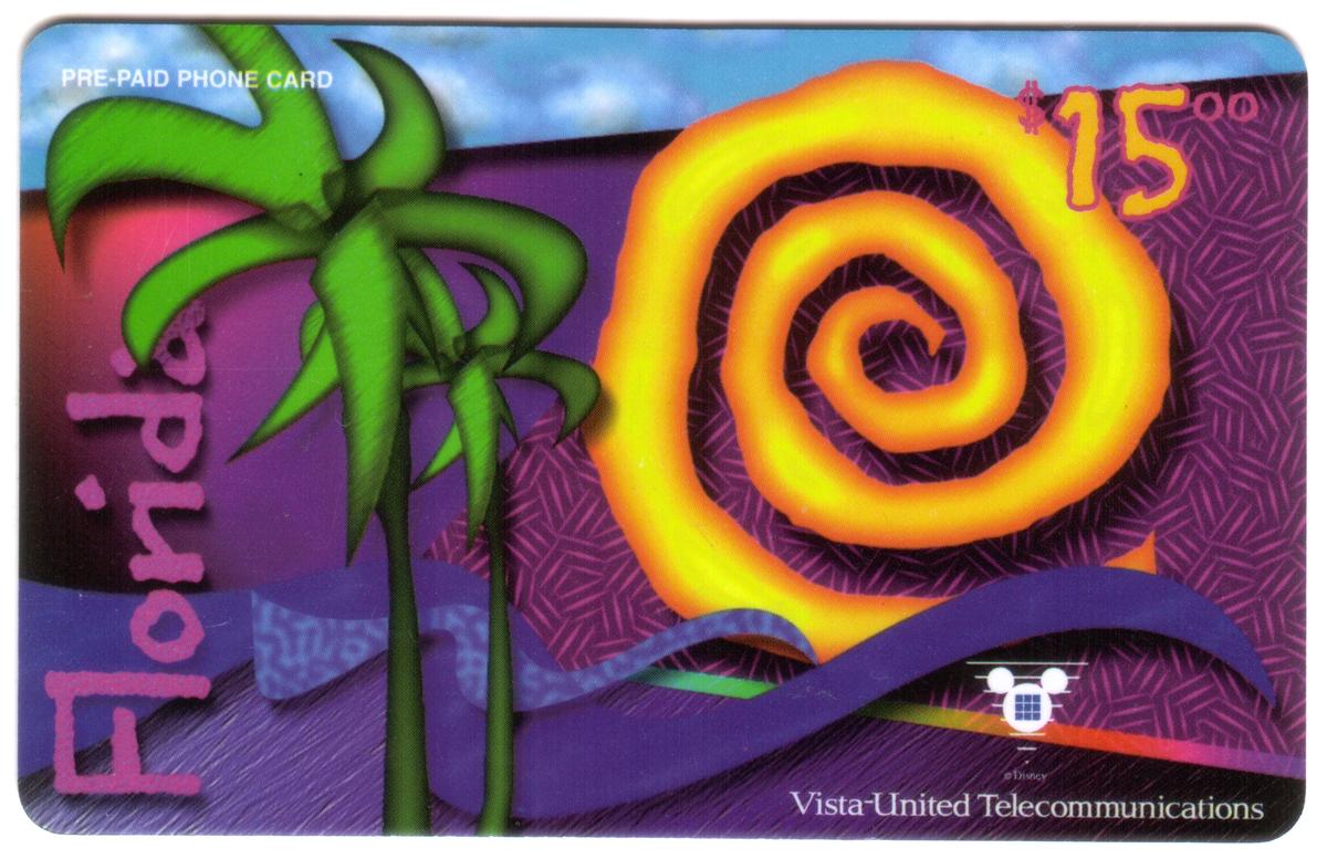 This set contains three collectible stock cards issued in 1996 by Vista-United (Disney), each featuring vibrant imagery related to Florida’s iconic palm trees and sun. The cards prominently display artistic representations associated with Walt Disney World and Walt Disney Land theme parks, highlighting the natural beauty and visual appeal of these amusement parks’ environments. The imagery includes tall, green Florida palm trees under a bright, sunny sky, capturing the essence of a warm, tropical setting common to these popular destinations.