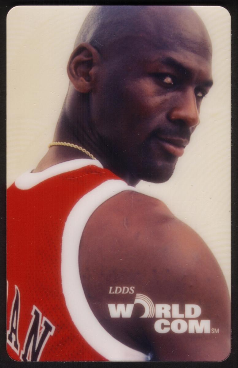 Printed on the lower right corner of the card are the logos and text "LDDS WORLD COM," signifying its association with WorldCom. The card is related to basketball and the NBA, highlighting a famous athlete known worldwide for his impact on the sport.