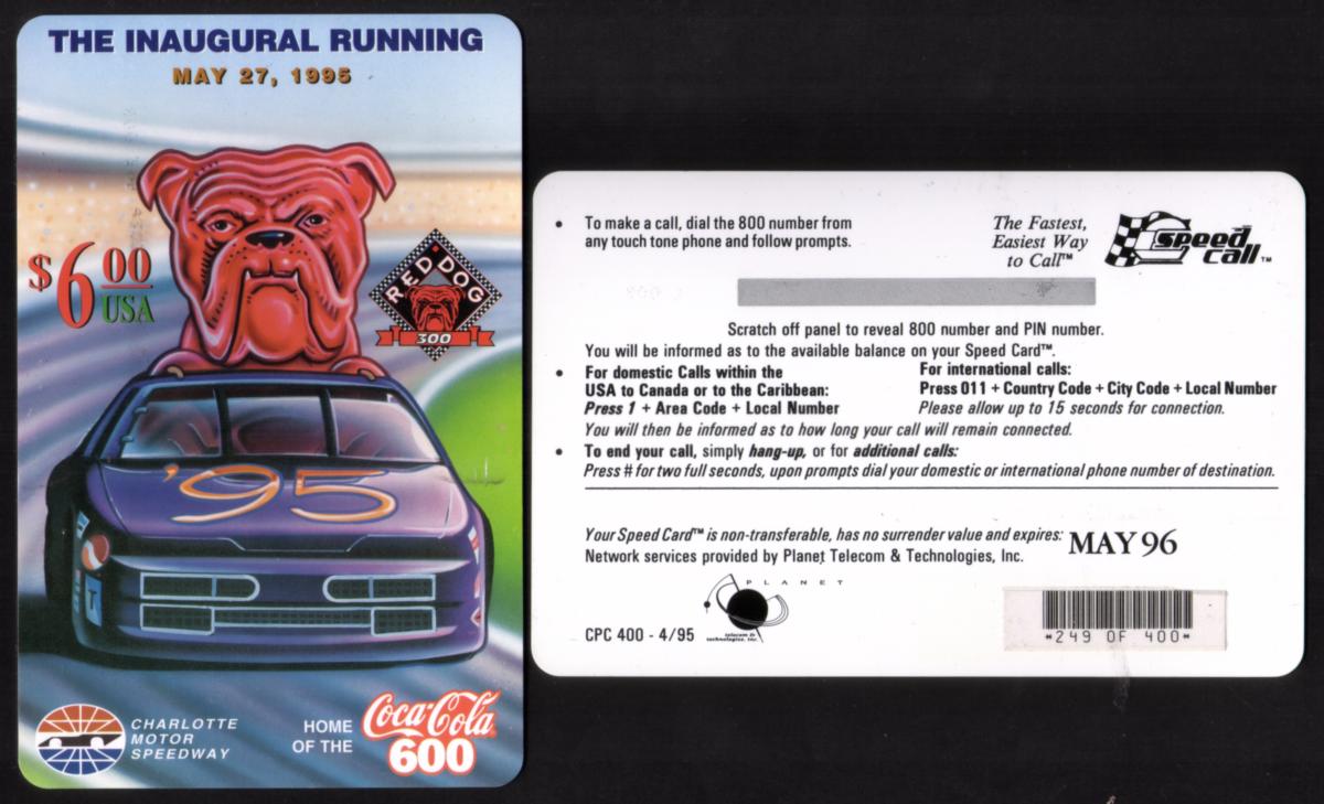 Keywords: Sports: Auto Racing, automotive, autos, automobiles, cars, COKE logos, Coca Cola logos, speedways, Charlotte NC, North Carolina, dogs, animals, Red Dog, speedcall, coca-cola, planet telecom, size about 4.25' x 6.50', Mercury Mkg SpeedCall