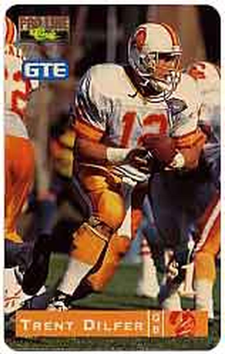 Trent Dilfer in Tampa Bay Buccaneers uniform, action shot, $1 value, GTE branding, Card #11 of 30, Printer’s Proof, NFL memorabilia, collectible phone card |
