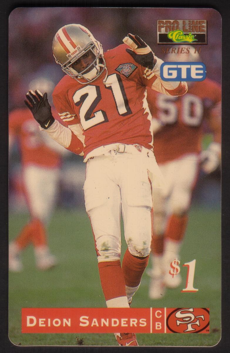 The card belongs to a series produced by The Score Board under GTE, reflecting its placement within a football-themed collection. The front design showcases the player’s image in full color, with the 49ers team name and official NFL and league logos placed on the card. The overall presentation highlights Deion Sanders as a key figure in this sports collectible series.