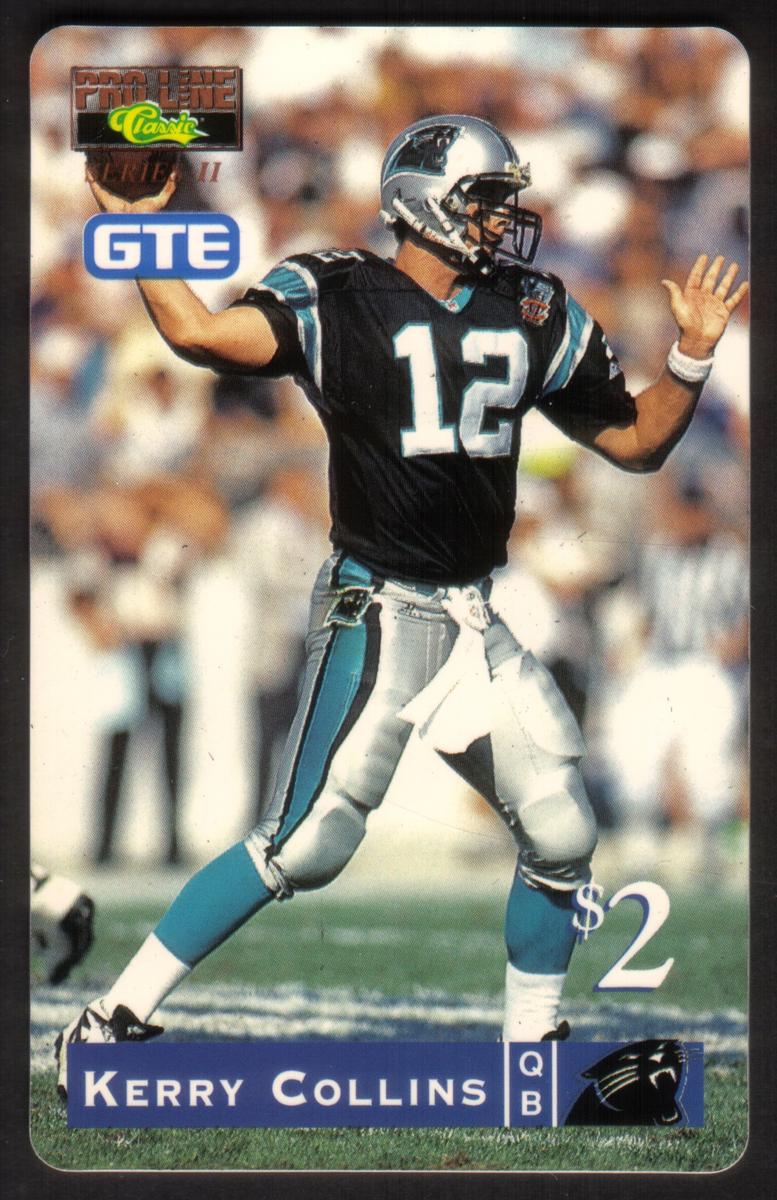 The front of the card includes multiple textual elements related to football and the NFL. The words "Sports: Football," "NFL," and "National Football League" appear prominently, highlighting the card’s sports theme. The design integrates a football field backdrop with graphics that emphasize its connection to professional football players. Kerry Collins’s name is clearly printed on the card, underscoring his role as the featured athlete.