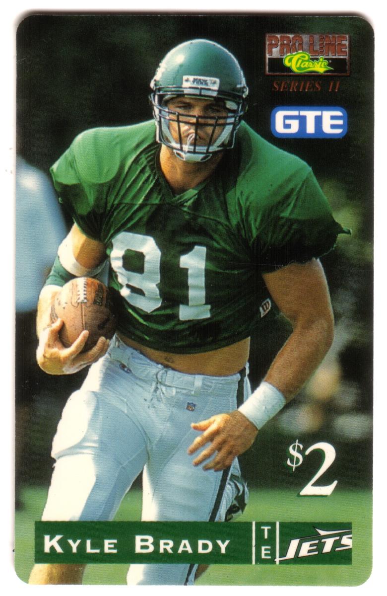 This collectible football card features NFL player Kyle Brady, identified as card number 19 out of a set of 25. Kyle Brady is depicted in full football gear, wearing a green jersey and helmet with white pants, engaged in action on the field. The background captures a stadium scene with blurred stands and a crowd, emphasizing the game's atmosphere.