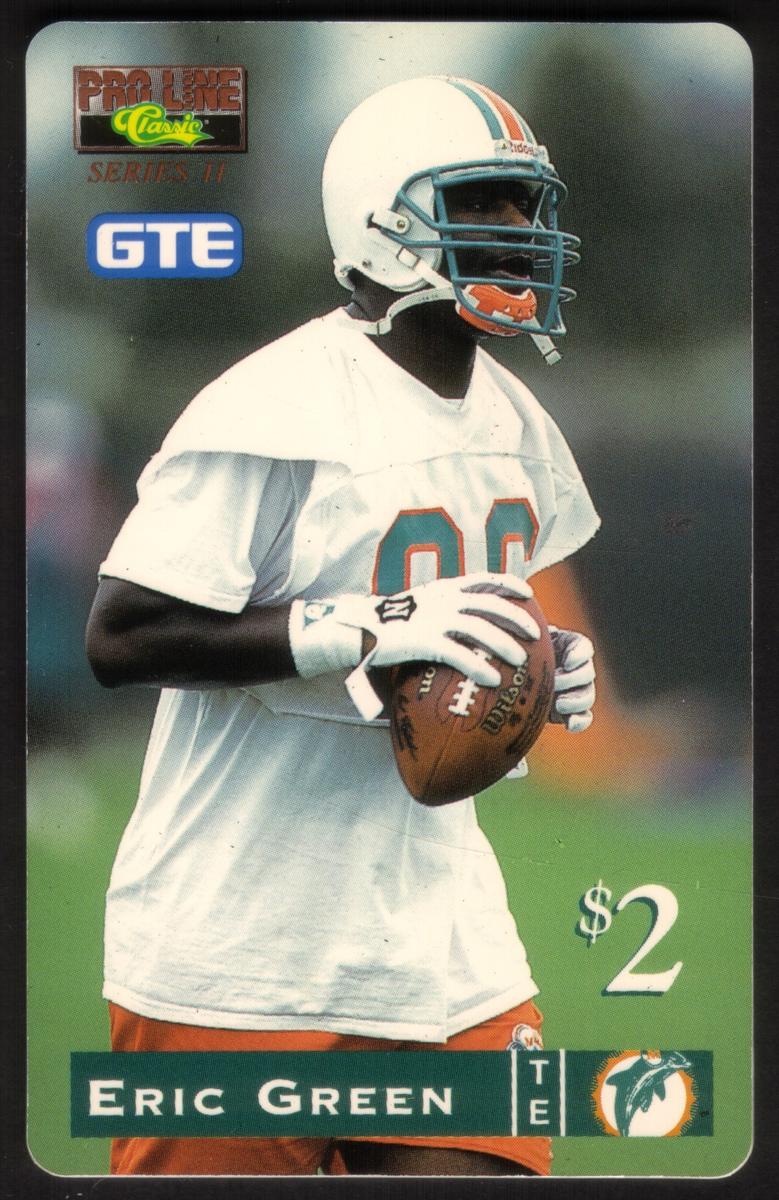 This card is part of a collectible series focusing on football players in the NFL, with specific attention to Eric Green’s career. The use of the Proline 2 name and the $2 value indicates its place among collectible phone cards dedicated to football athletes.