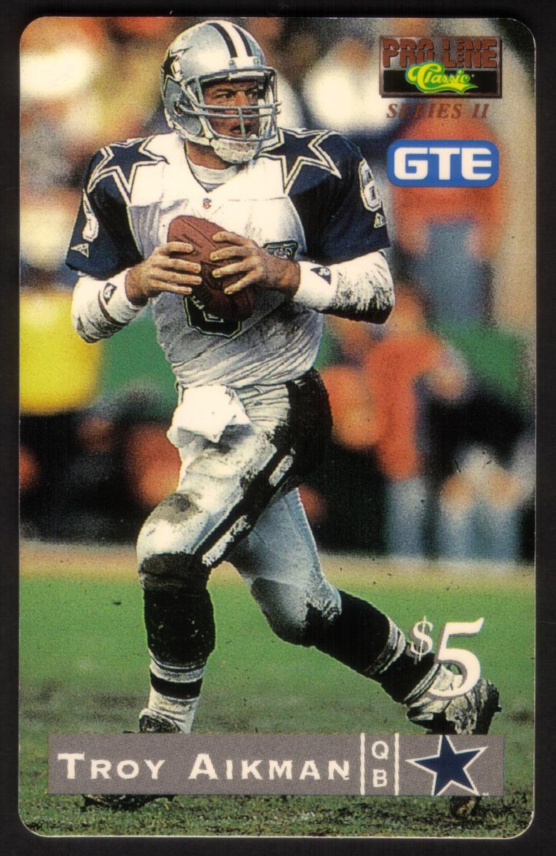 This card is a collectible phone card related to professional football, combining sports memorabilia with telecom functionality. It highlights Troy Aikman’s significance as a football player within the league and serves both as a collectible item and a functional card.