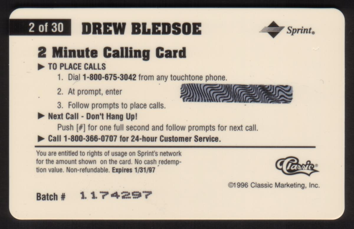 The card is part of the Assets series issued in 1996 and has a $2 value indicated in gold at the top left corner. The lower border of the card features the Assets logo on the left and the Sprint logo on the right. The name "DREW BLEDSOE" is printed in capital letters across the bottom in white text against a red background.
