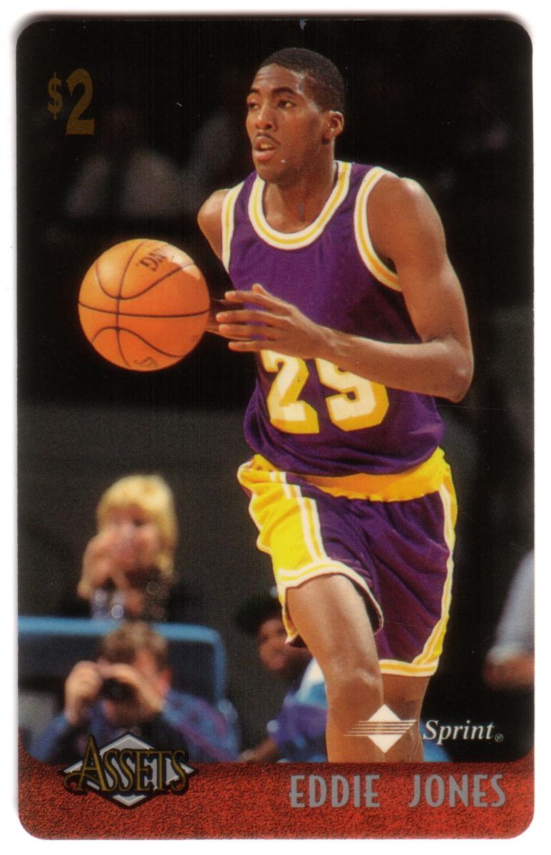 This card is part of the 1996 Assets series, capturing notable basketball players of that period. It highlights Eddie Jones in action or portrait style, celebrating his contributions to the sport during that time. The overall presentation is designed for collectors interested in NBA memorabilia, specifically basketball trading cards from the mid-1990s.