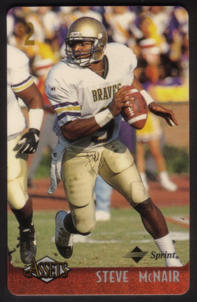 The bottom section of the card includes the "Assets" logo on the left side, with the player’s name, "STEVE McNAIR," printed in white capital letters against a red background strip. The Sprint logo appears in black at the bottom right corner, indicating sponsorship or branding connected to the card.