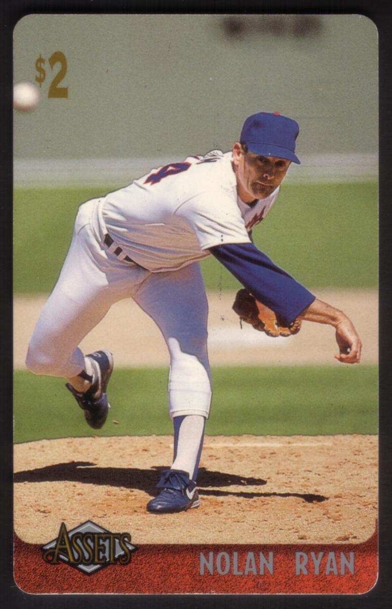 This collectible phone card features a photographic image of Nolan Ryan, a renowned Major League Baseball pitcher, in mid-pitch on a baseball field. Nolan Ryan is dressed in a white baseball uniform with blue socks and blue cleats. He wears a white jersey with dark sleeve cuffs and a blue baseball cap. The card captures him on the pitcher's mound, with the focus on his intense pitching form.