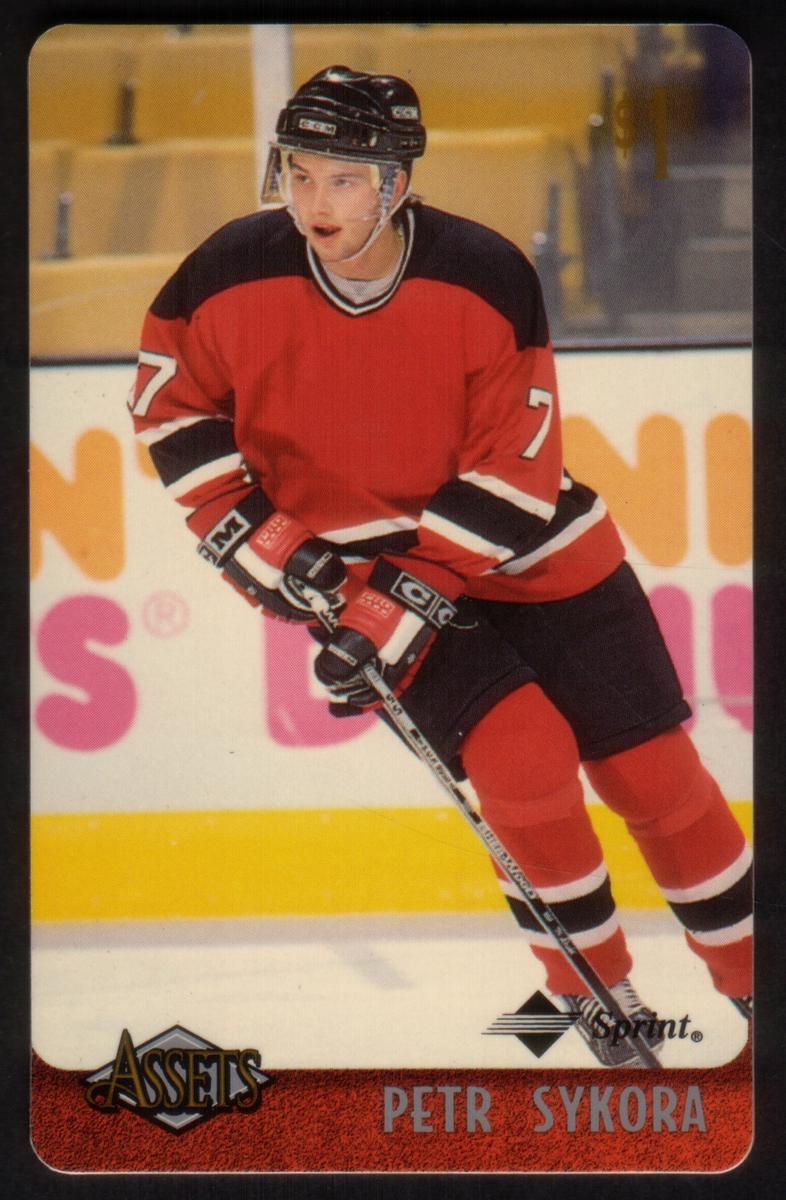 This collectible card features Petr Sykora, a professional hockey player in the National Hockey League (NHL). The card is part of the Assets '96 series produced by The Score Board Inc. It is card number 27 out of 30 in this series. Petr Sykora is shown wearing hockey gear, including a helmet, and is captured in an action pose related to the sport of hockey. The design prominently highlights the NHL and hockey themes, with the player’s name, Petr Sykora, clearly displayed on the front.