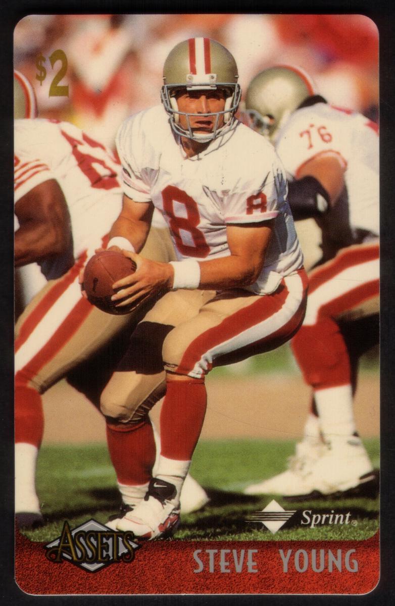 The card includes the NFL and National Football League logos, signifying its official football association. The text "Steve Young" is clearly printed on the card, along with the series name "Assets '96" and the numbering indicating its place in the series. Design elements incorporate football imagery and graphics consistent with mid-1990s sports collectibles.
