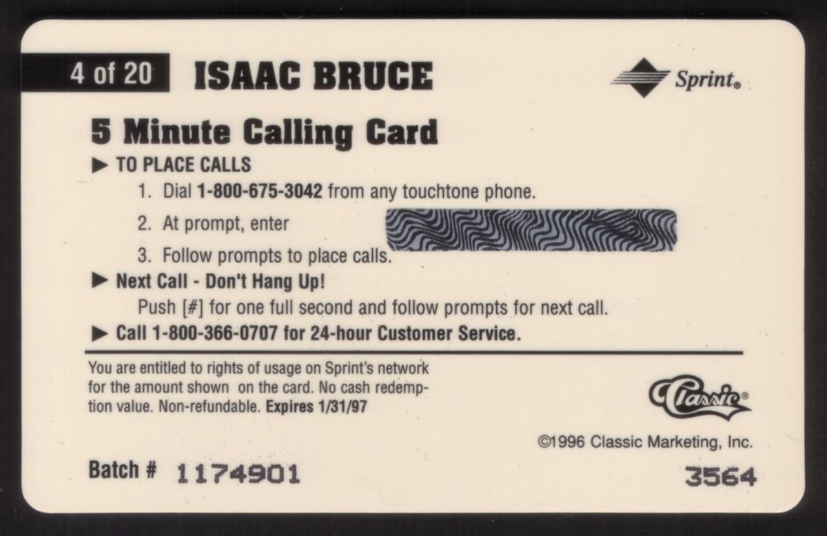 The card has a $5 denomination indicated in the top left corner and includes several key design elements. The bottom section displays the "Assets" logo in gold on the left, and the name "ISAAC BRUCE" is printed in uppercase white letters against a red textured background. The Sprint logo appears in the lower right corner, representing the card's issuing company. In the background, other players and team members are visible, dressed in yellow pants and white jerseys with blue numbers, suggesting the team’s colors.