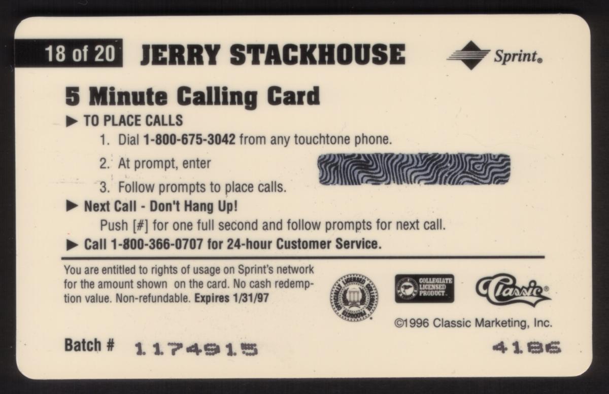 The background includes a referee wearing a black and white striped shirt and black pants, positioned behind Stackhouse. There are spectators and a visible advertising banner for Pepsi along the sideline. The bottom of the card displays the Assets logo on the left and the Sprint logo on the right. Jerry Stackhouse’s name is printed in white capital letters at the base of the card.