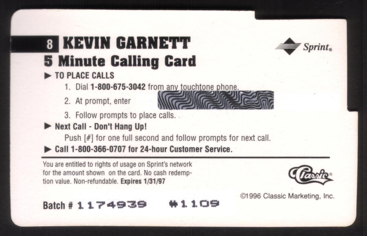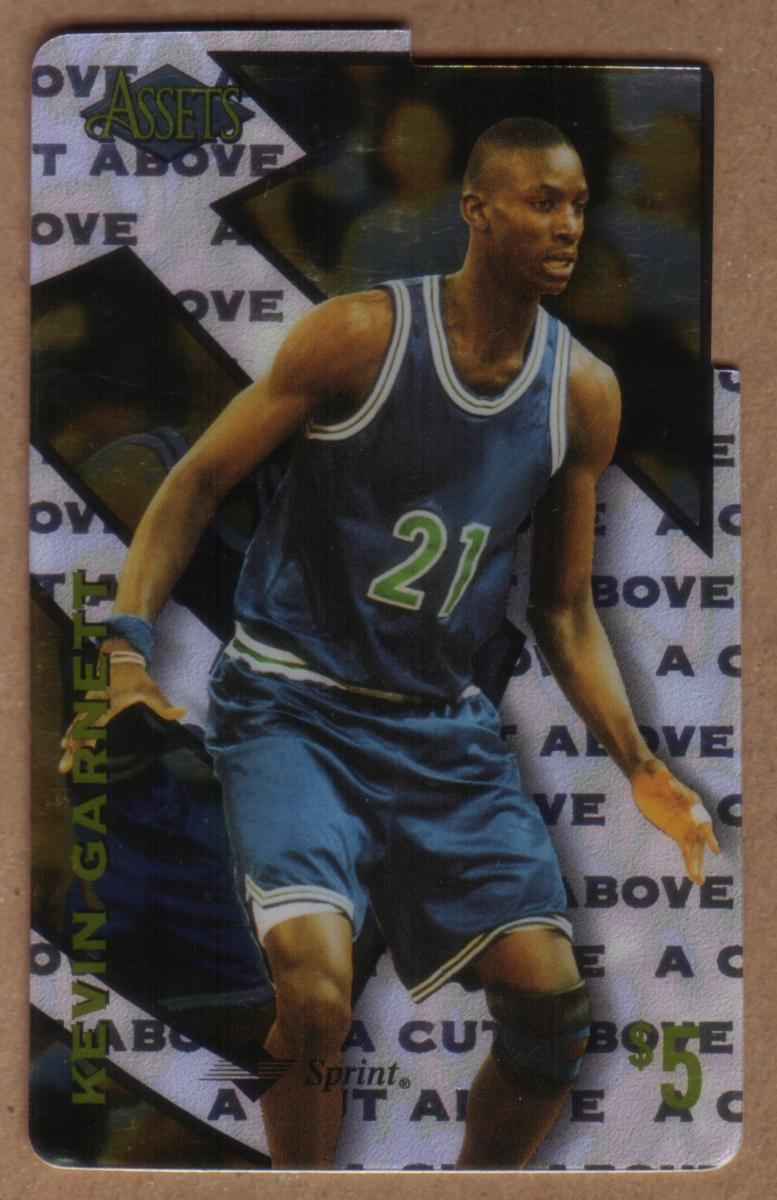 This card highlights Kevin Garnett as a prominent NBA basketball player within the National Basketball Association, emphasizing the sport of basketball and collectible phone cards related to basketball players.