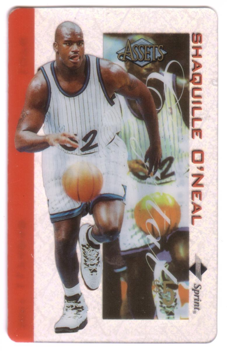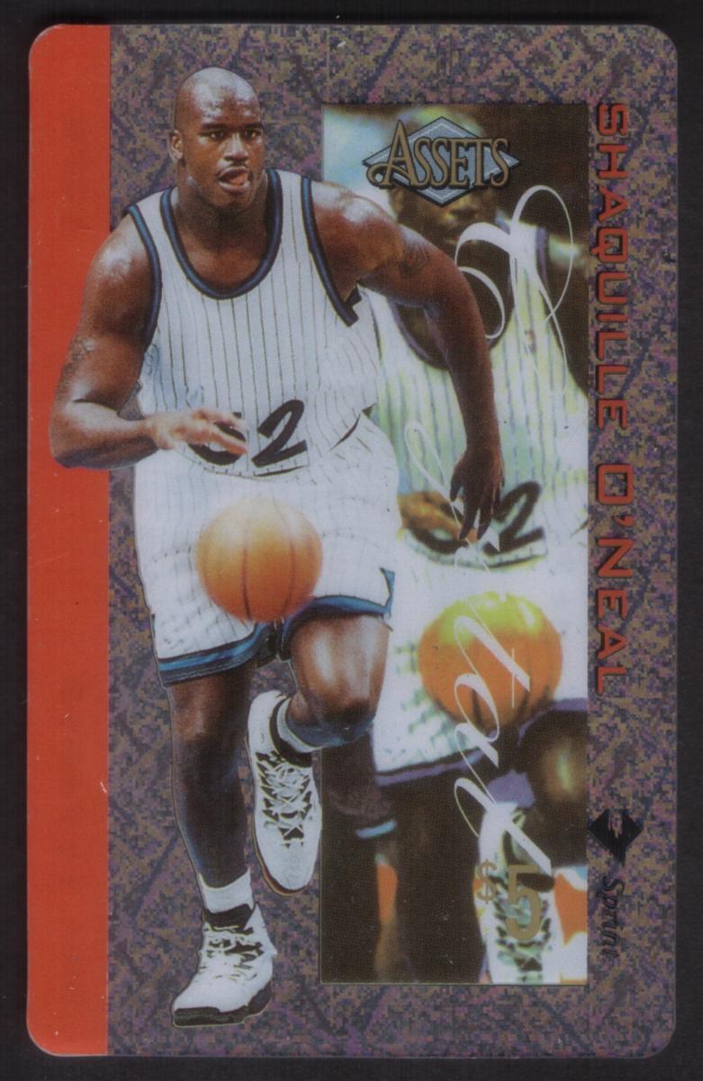 The top center of the card displays the "Assets" logo in gold and black, accompanied by a holographic or reflective inset image of O'Neal in the same pose, adding depth and shine to the design. The overall background features a textured pattern in purples and blues, giving the card a dynamic and collectible appearance.