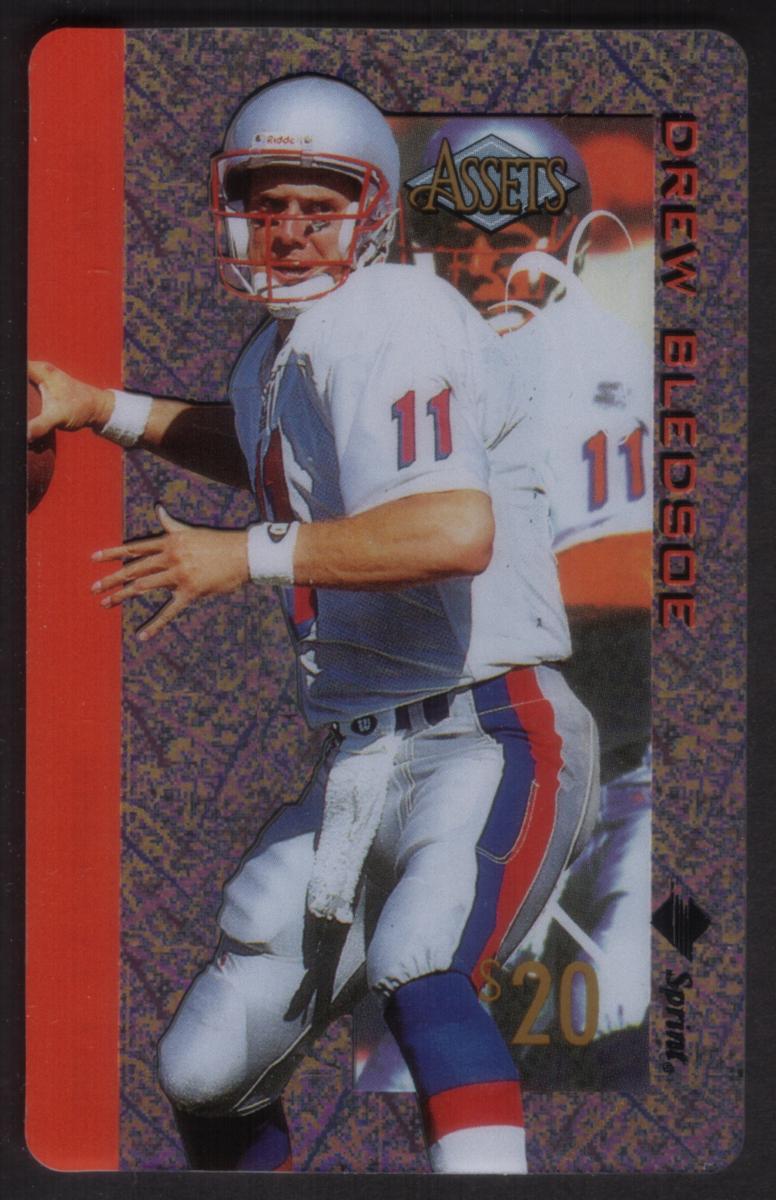 The background includes a textured, marbled purple design with the "Assets" logo prominently displayed near the top center. The right side of the card vertically spells out “DREW BLEDSOE” in bold letters with a metallic effect. A large gold "20" is visible near the bottom right, indicating the card’s value or a special edition marking. The card also carries the Sprint logo in the bottom right corner, indicating sponsorship or affiliation.