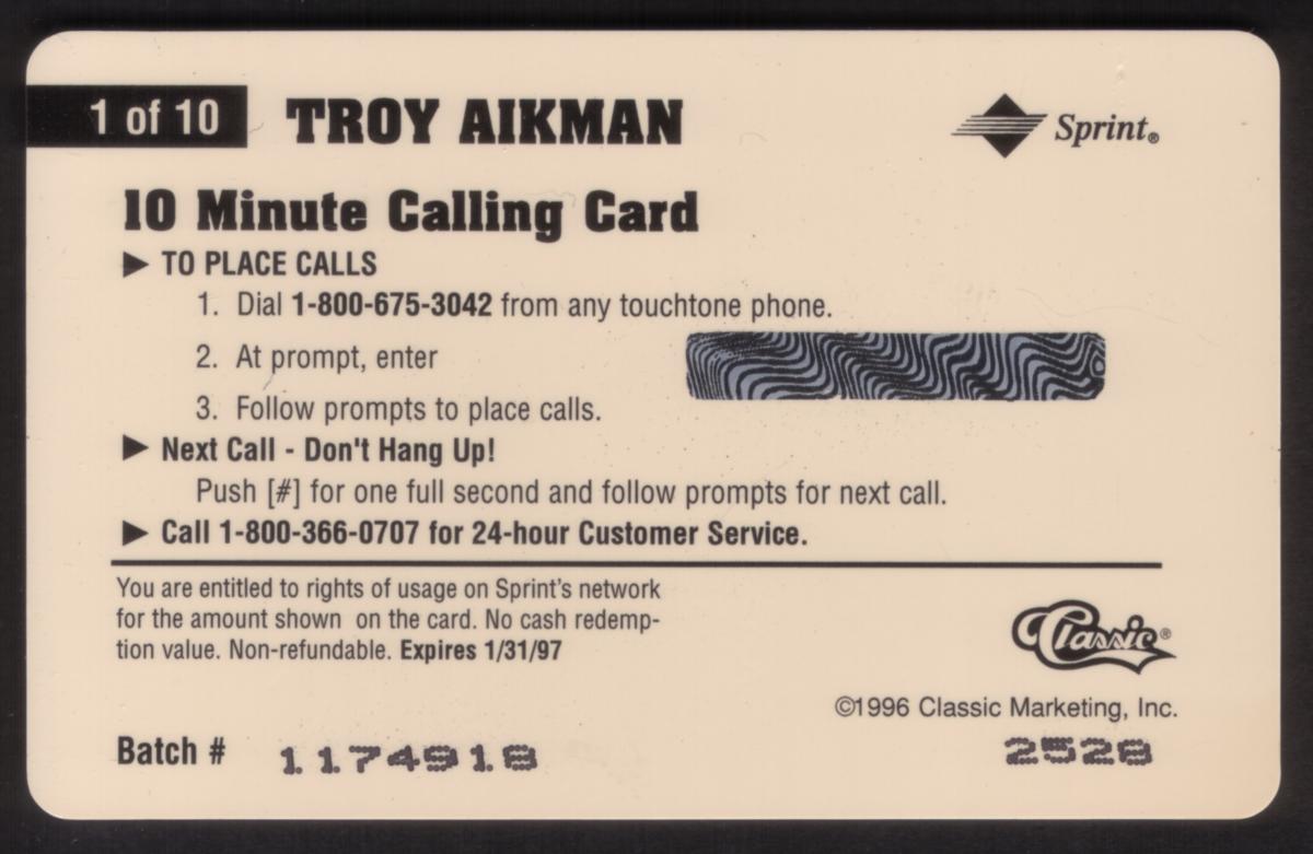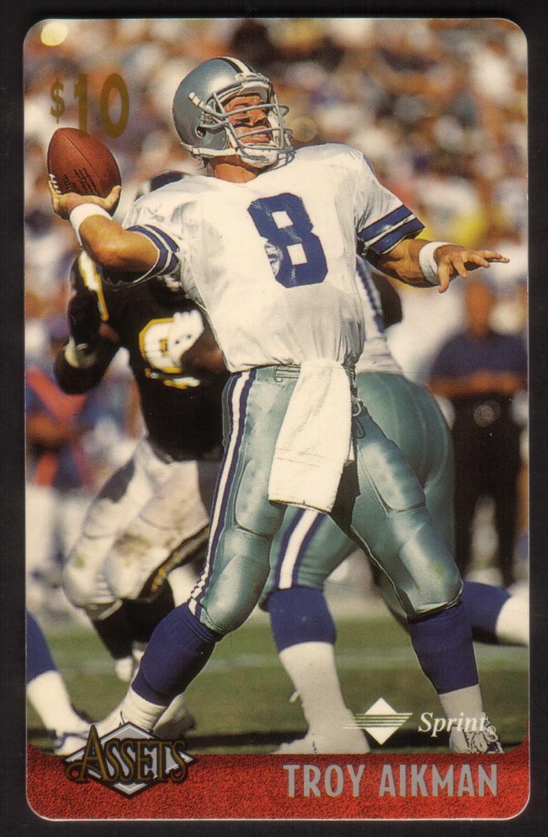 The card is part of the Assets '96 series produced by The Score Board Inc. It has a $10 denomination printed in gold at the top left corner. The word "ASSETS" appears in black and gold stylized font near the bottom left, while the lower right corner reads "TROY AIKMAN" in white block letters on a red band along with the Sprint logo above his name in white.