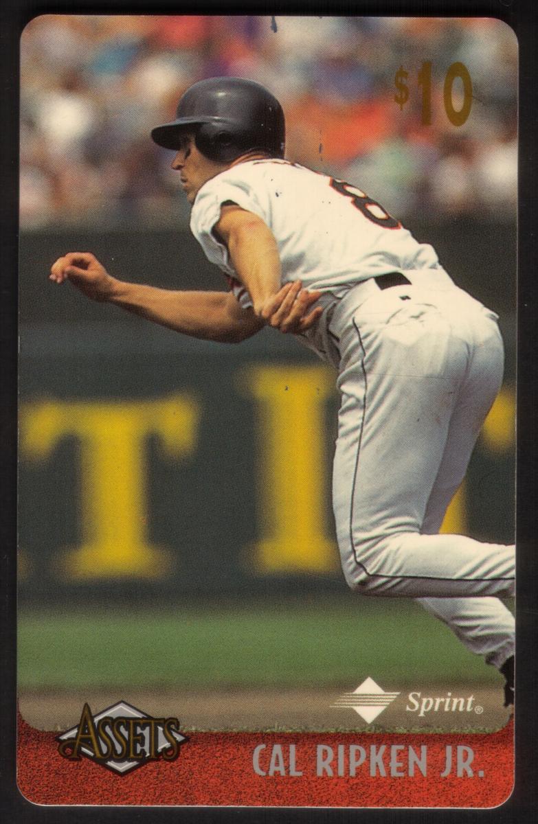 The card includes a $10 denomination printed in gold in the upper right corner. In the bottom section of the card, the word "ASSETS" appears in a stylized logo on the left side. Next to this logo, the Sprint logo is prominently displayed, confirming the sponsor or issuing company. The player's name, "CAL RIPKEN JR.," is printed in white capital letters at the bottom right portion of the card on a red background texture.