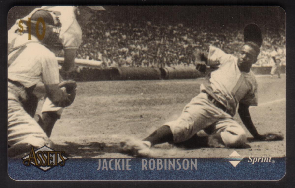 The card includes the logo "Assets '96" and the value "$10" printed in gold in the top left corner. The bottom section has a blue banner with the name "JACKIE ROBINSON" in capital letters. The word "Sprint" appears in white in the bottom right corner of the card.