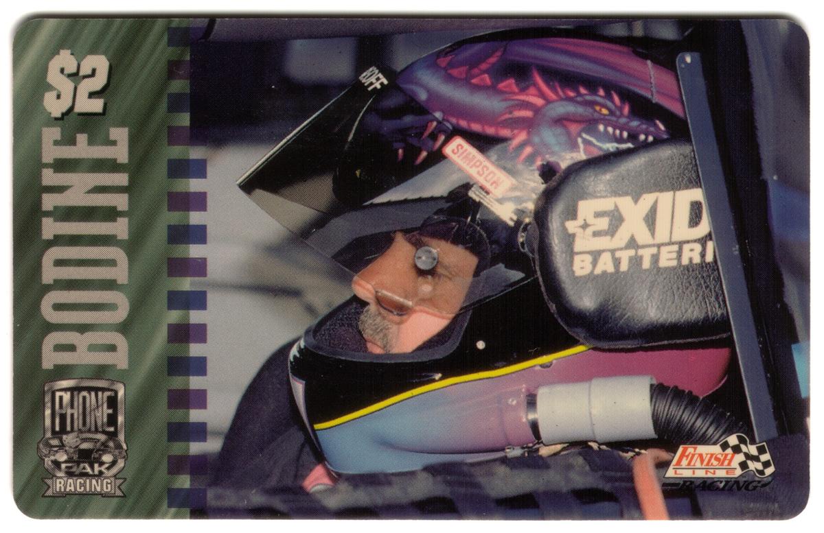 This collectible phone card features Geoff Bodine, a NASCAR driver, depicted wearing a racing suit and helmet without any visible number on the helmet. The card highlights Bodine’s association with Exide Batteries, prominently displayed on the card. The design captures the spirit of auto racing and the NASCAR sport, focusing on the Finish Line Racing theme from 1996. The card carries the “Simpson PhonePak 1996 $2” designation, indicating its collectible value and use as a phone card.