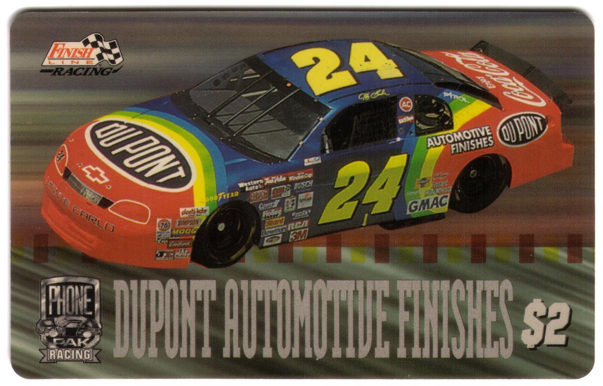 This collectible phone card features imagery related to auto racing, specifically NASCAR. The central focus is on a racing car prominently displaying the number 24. The car carries sponsorship branding for Coca-Cola and DuPont Automotive Finishes, emphasizing its connection to automotive products and racing culture. The design highlights the vibrant red, white, and yellow color scheme typical of the DuPont-sponsored vehicles driven by the NASCAR team.