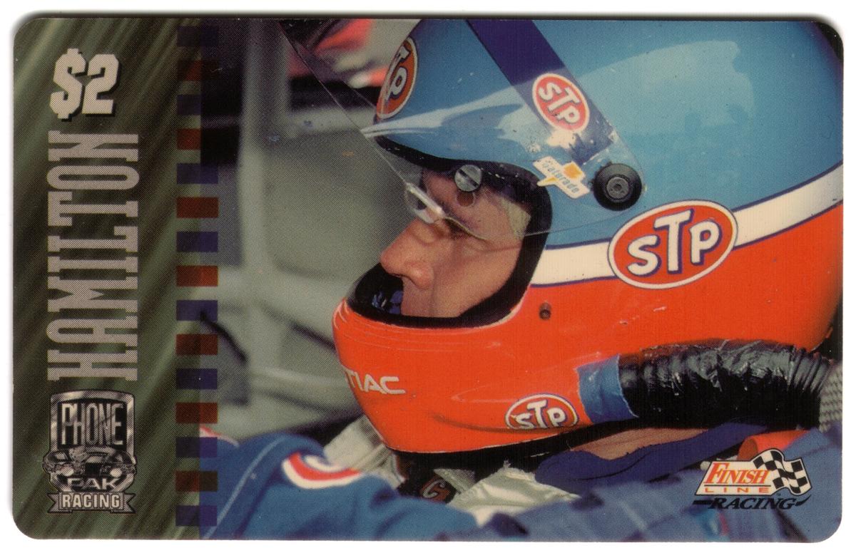 This collectible PhonePak card from 1996 features NASCAR driver Bobby Hamilton. The card highlights Hamilton’s affiliation with STP and Gatorade, two prominent corporate brands visible on the design. It captures key elements of auto racing, displaying a colorful, dynamic composition with images of racing cars and the finish line motif, emphasizing the theme of competitive motorsports.