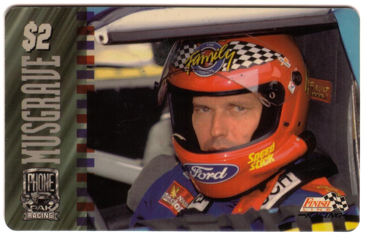 This collectible phone card features a racing theme centered on NASCAR and auto racing. It prominently displays Ted Musgrave, a professional driver known for his involvement in NASCAR. The card highlights Musgrave driving a Ford car adorned with corporate logos including Speed Stick and Family Channel. The design incorporates the branding of Finish Line Racing as well as sponsor references to Winston and Gatorade, representing prominent names in NASCAR during the 1990s.