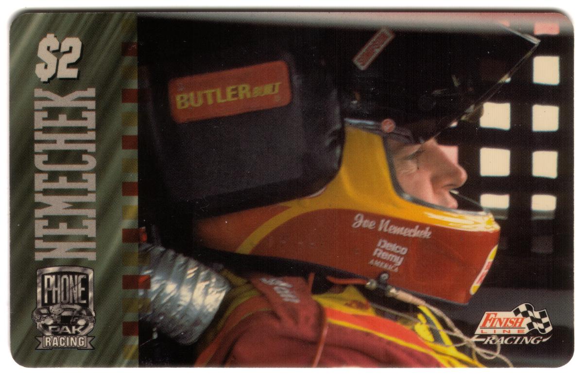 This card serves as a collectible piece for fans of auto racing, particularly those who follow NASCAR and Joe Nemechek. The references to specific manufacturers and the $2 denomination further establish its place among racing collectibles tied to the 1996 Simpson PhonePak series.