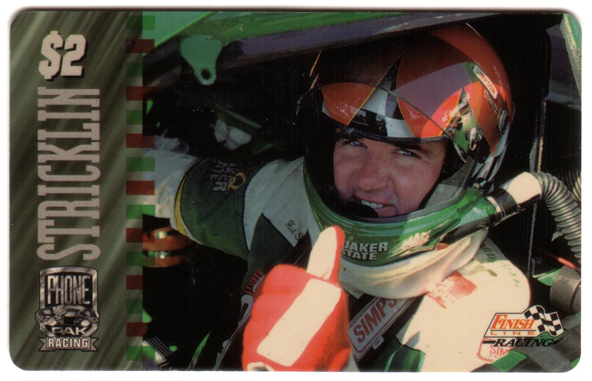 This collectible phone card features an image focused on auto racing, specifically NASCAR. The card highlights Hut Stricklin, a professional NASCAR driver, associated with the Quaker State brand. The design incorporates logos and trademarks related to the automotive and racing industries, including notable corporate trademarks such as Simpson and Quaker State. The card commemorates the 1996 Quaker State PhonePak series, with a $2 denomination.