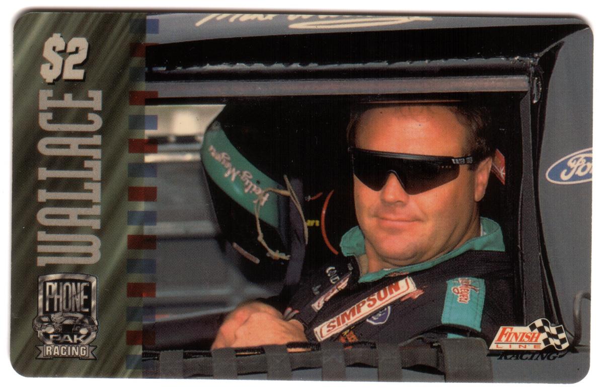 Corporate brand names Heilig Meyers and Simpson appear clearly on the race car’s body, highlighting the automotive sponsorship important in NASCAR racing culture. Mike Wallace’s identity is central to the card’s theme, linking the collectible directly to the driver’s role in the 1996 Finish Line Racing team. This card serves as a unique collectible combining motorsport graphics and phone card utility, celebrating NASCAR’s competitive atmosphere through its design and featured elements.