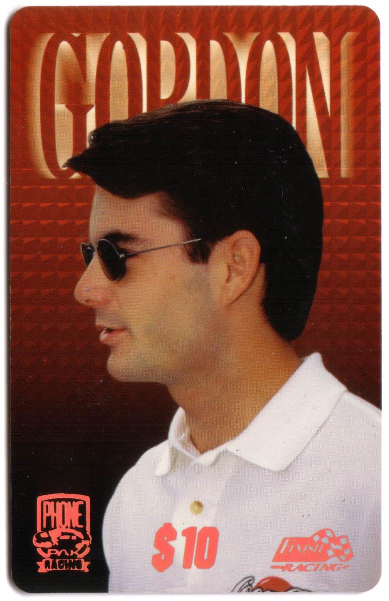This collectible PhonePak 1996 $10 phone card features a profile photographic image of Jeff Gordon, a famous NASCAR driver. Jeff Gordon is shown wearing black, round sunglasses and a white collared shirt with a golden button. His dark hair is styled neatly, and he faces left. The background of the card is a patterned red with the large gold text "GORDON" at the top, referencing Jeff Gordon's last name.