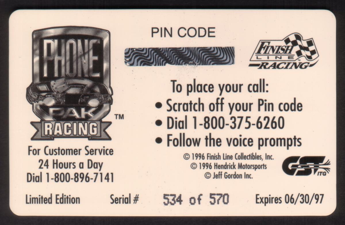 This card is a collectible item related to auto racing, specifically focusing on Jeff Gordon's prominence in NASCAR during the mid-1990s. The visuals, text, and logos firmly connect it to the PhonePak brand and the sport of auto racing, serving as a tribute to Jeff Gordon’s racing achievements.