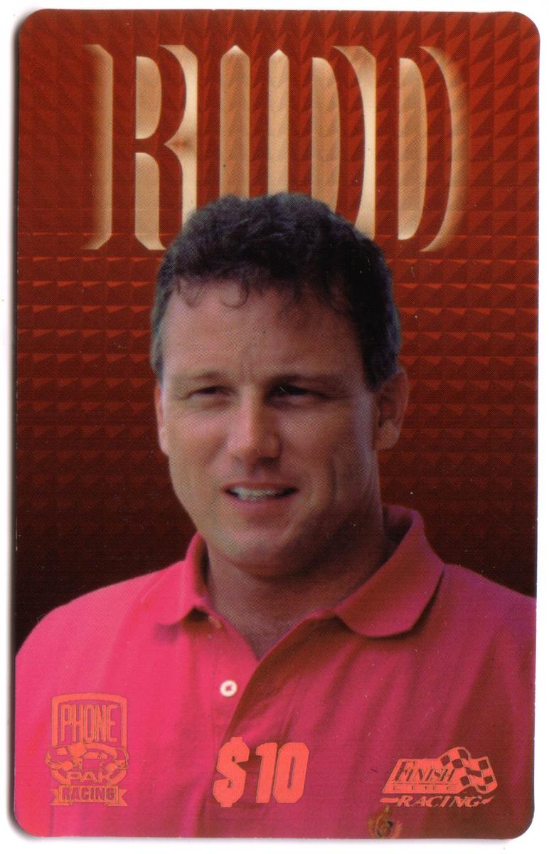 This collectible phone card features an image from the world of NASCAR auto racing. It prominently displays Ricky Rudd, a well-known NASCAR driver, behind the finish line, emphasizing his presence in the sport. Ricky Rudd is pictured in his racing gear, highlighting the intensity and excitement associated with high-speed stock car racing.