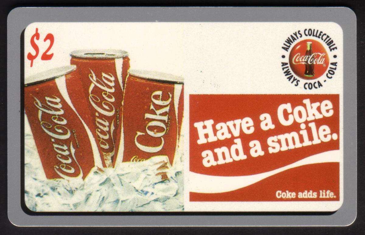 This collectible card features a vibrant image centered around three cans of Coca-Cola resting on a bed of ice cubes. Each can prominently displays the classic Coca-Cola logo with the distinctive white script on a red background. Above the cans, the phrase "Have A Coke And A Smile" is printed in bold white letters, emphasizing a cheerful and inviting message. The design reflects Coca-Cola advertisements from the 1970s, capturing the nostalgic styling and branding of that era.