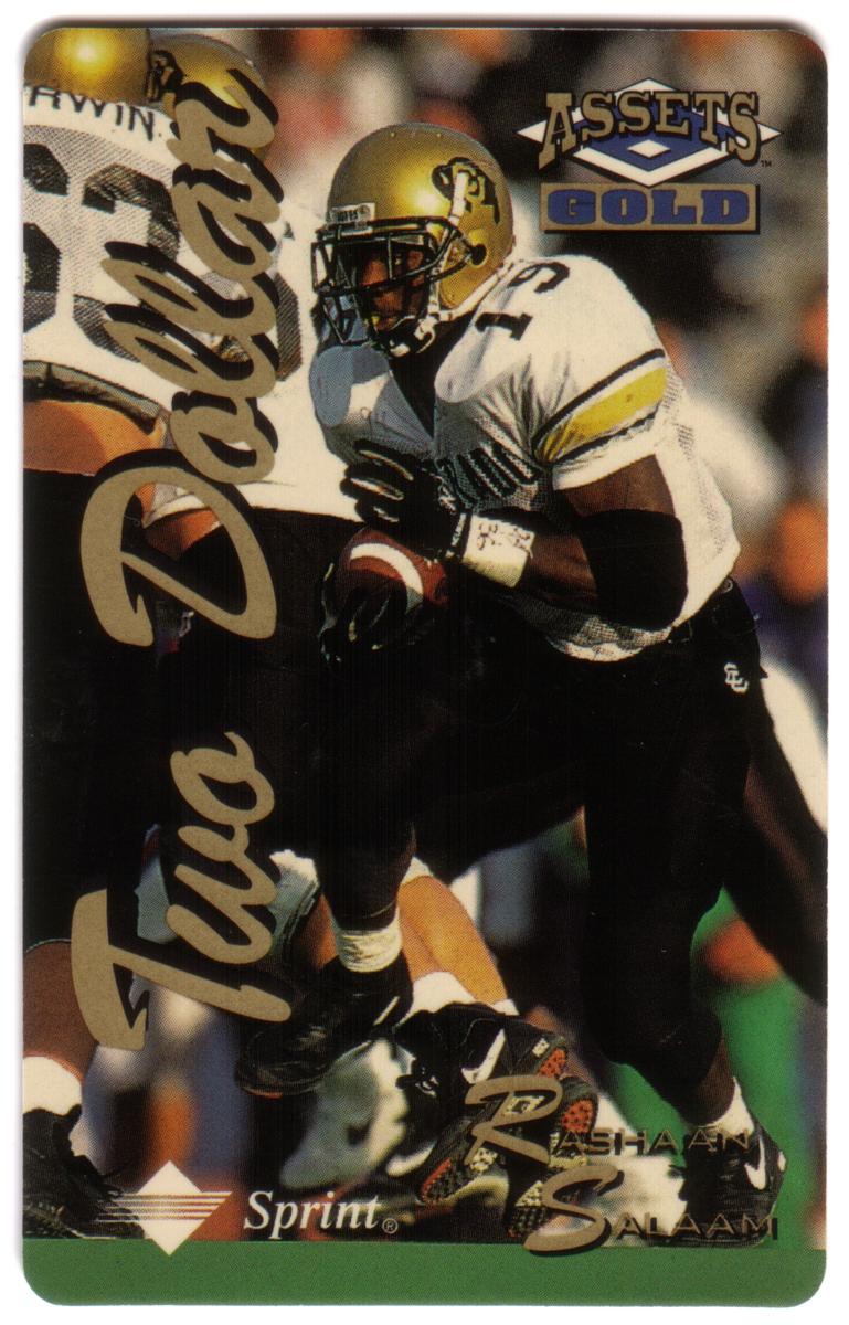 The overall design incorporates the themes of the NFL and professional football, focusing on Rashaan Salaam as the featured athlete. The card’s colors and layout provide a strong sports memorabilia appeal, making it valuable to collectors interested in NFL players and football-related collectibles.