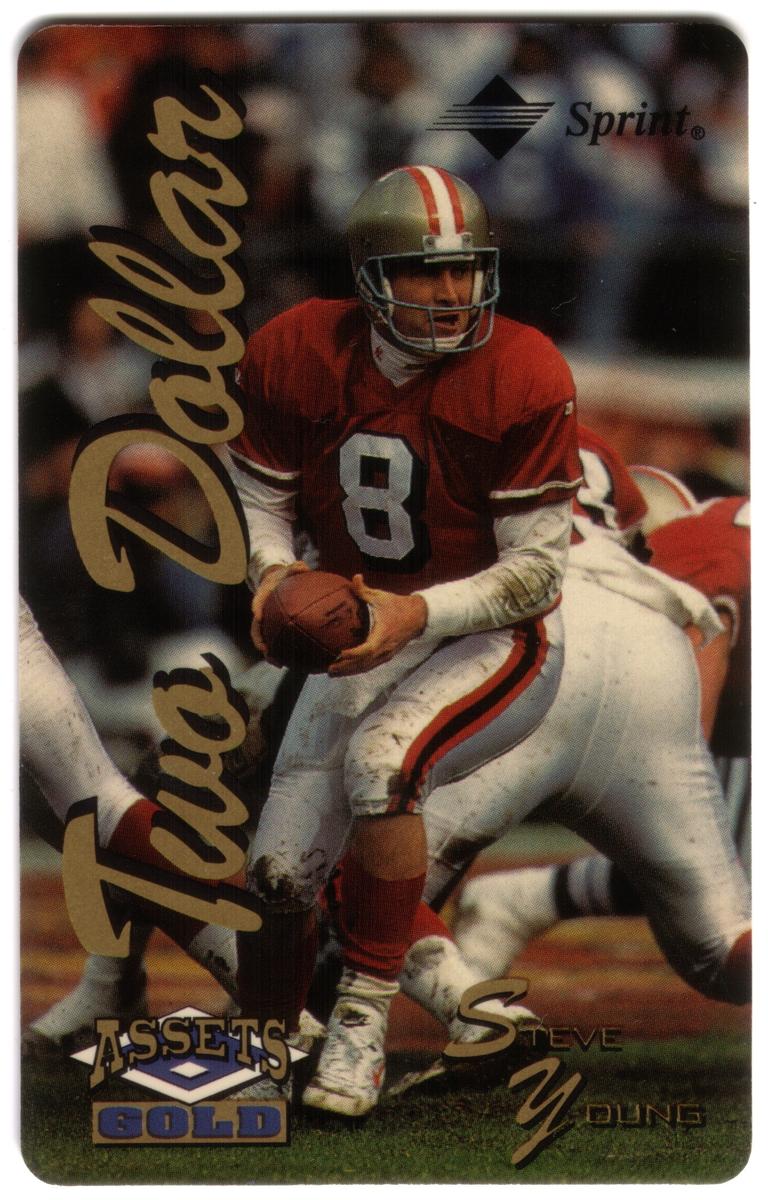 This card belongs to a sports-themed series focusing on American football and the NFL. The imagery and logos clearly place this collectible within the realm of football memorabilia honoring Steve Young’s legacy and career achievements. The use of gold foil for the asset value adds a premium, collectible feel to the card.