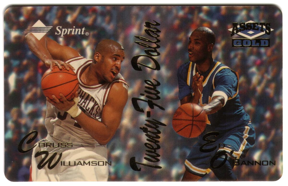 The card is marked with the Sprint logo in the top left corner and the "Assets Gold" logo in the top right corner. The players’ names, "Corliss Williamson" and "Ed O’Bannon," are printed in black script on the lower left and right sides, respectively. The phrase "Twenty-Five Dollar" is prominently displayed in black script running diagonally across the center of the card, indicating the card's value.