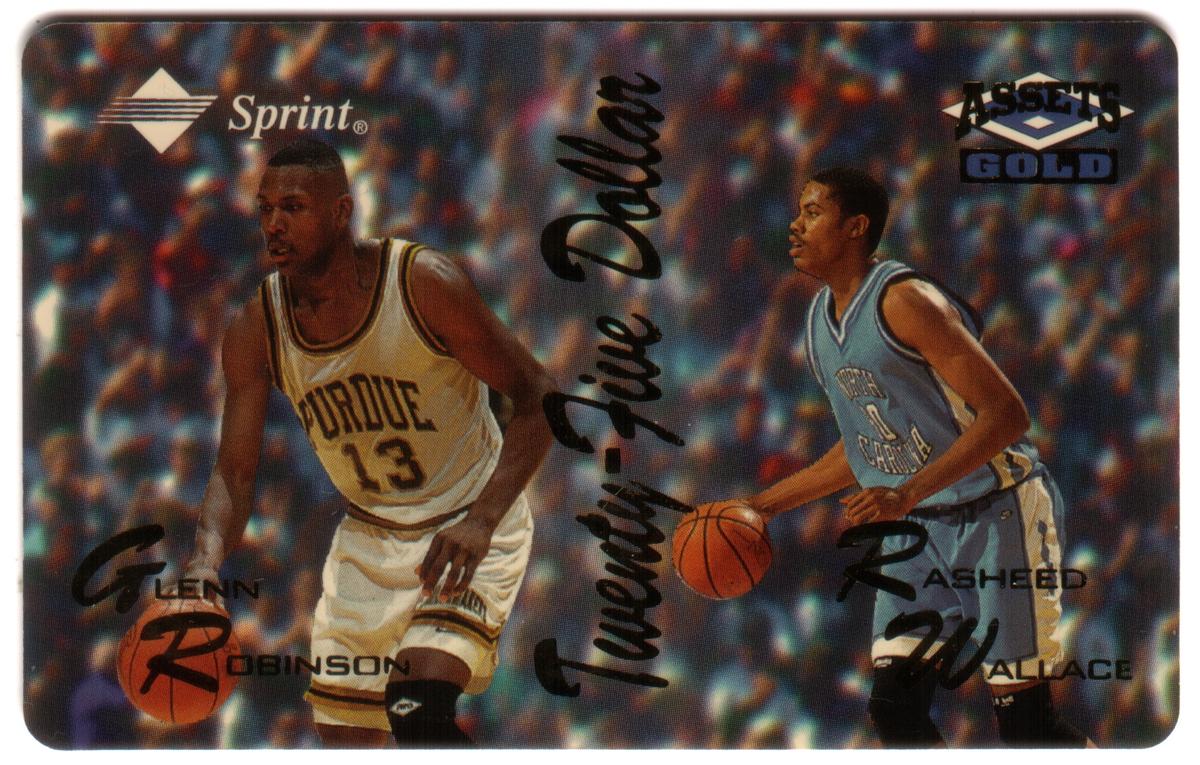 The top left corner features the Sprint logo, while the top right corner displays the Assets Gold logo with the word "Gold" underneath. The names "Glenn Robinson" and "Rasheed Wallace" appear near the bottom of the card, each positioned next to the corresponding player. The overall design has a detailed, colorful background representing a crowd in an arena, adding to the dynamic basketball atmosphere depicted on the card.
