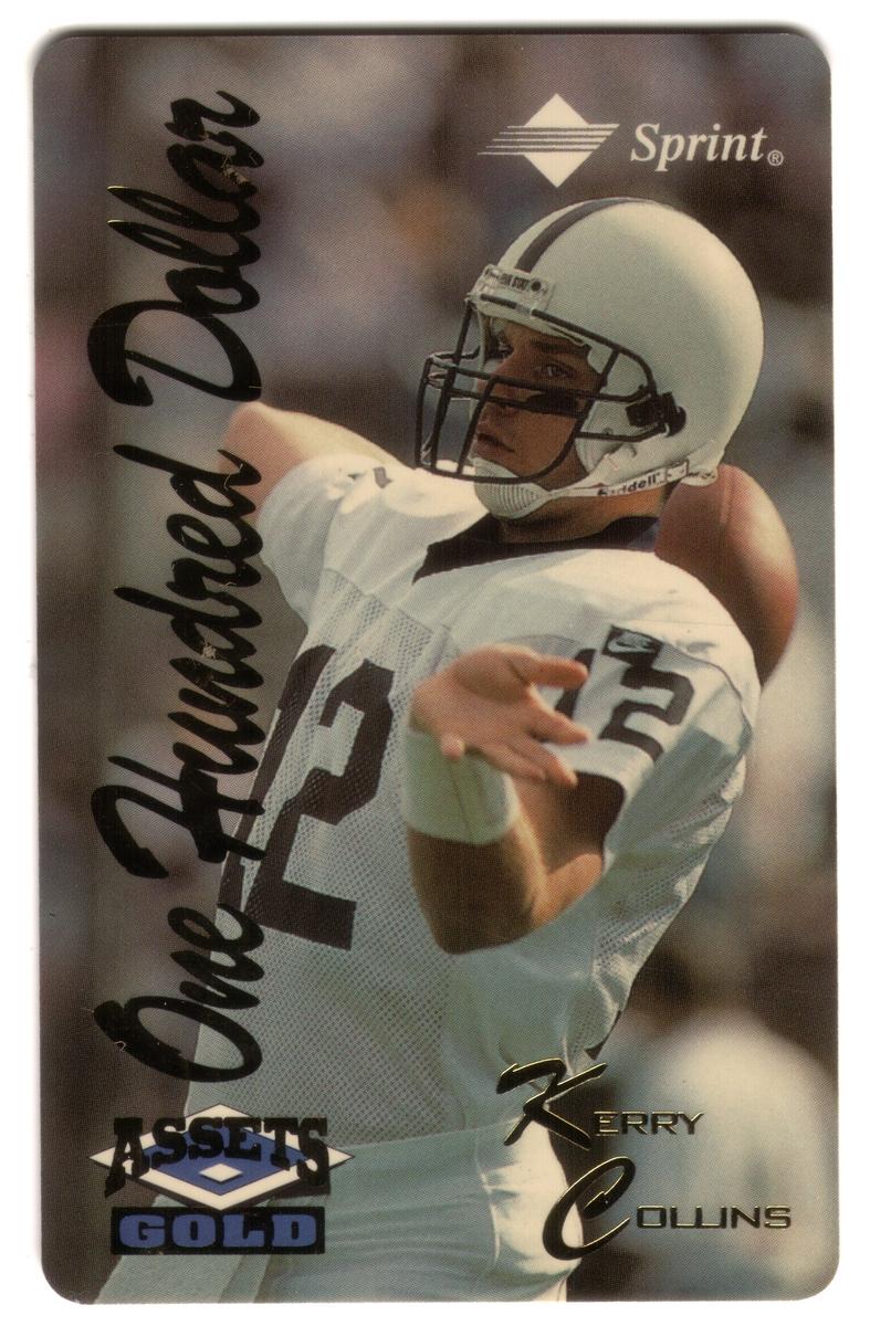 This card is associated with the NFL and represents a sports collectible from The Score Board Inc., valued at $100 as indicated on the card. It highlights Kerry Collins' identity as an NFL player and is part of the Assets Gold series.