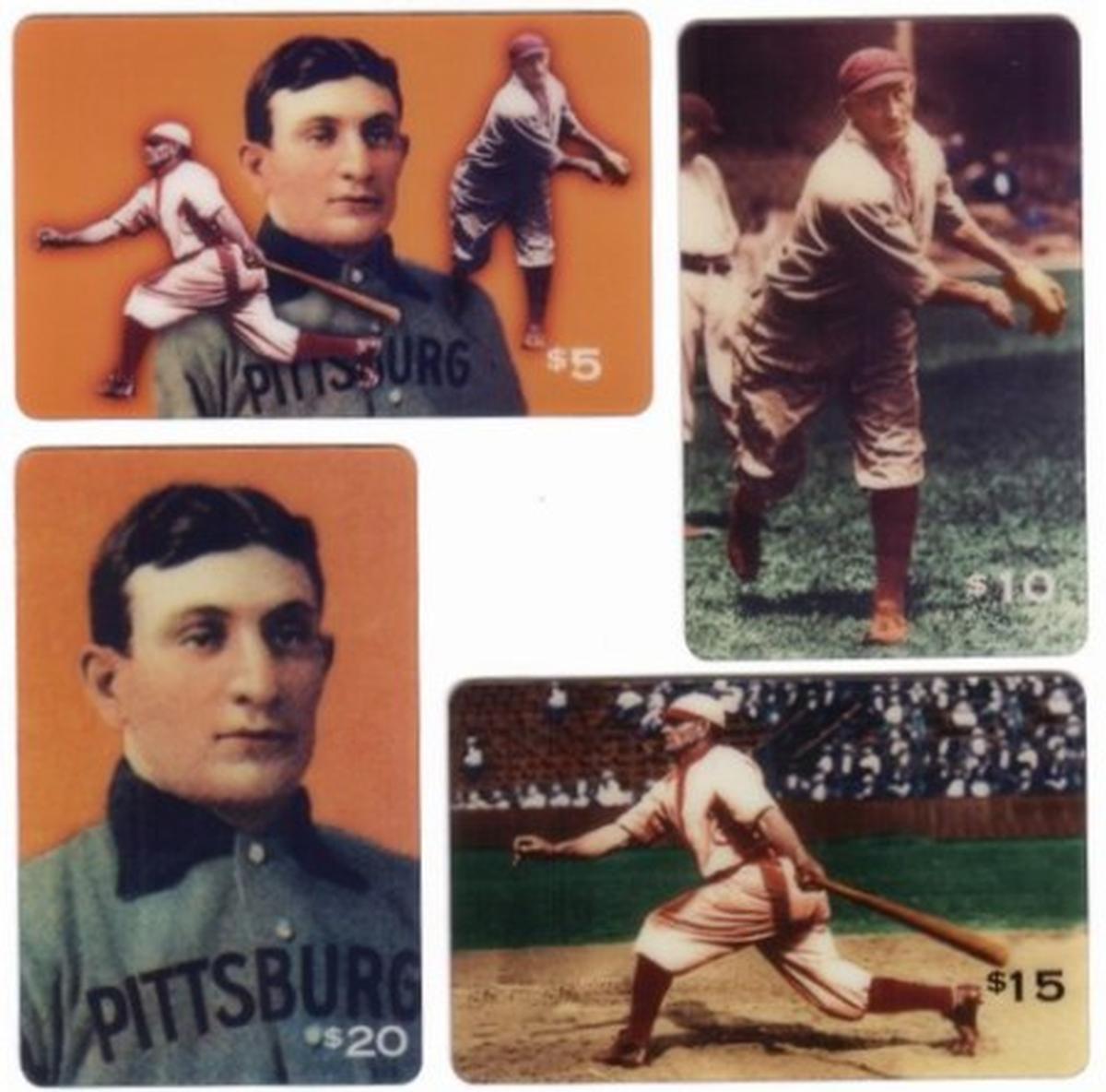 This collectible set features four Major League Baseball phone cards highlighting Honus Wagner, a legendary player known for his historic impact on the sport. Each card prominently displays the name “Honus Wagner” along with the Champion Sports Collection logo. The cards are part of a set produced by Premier Marketing Group Inc. and CS Marketing Inc., clearly indicated by the names on the cards.