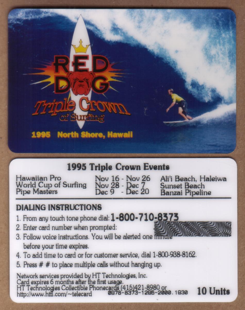 1995 Red Dog Triple Crown of Surfing phone card featuring Hawaii surf scenes, event details, Red Dog branding, and 10-unit prepaid calling functionality. |