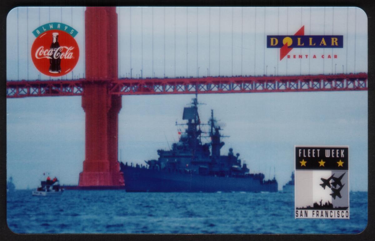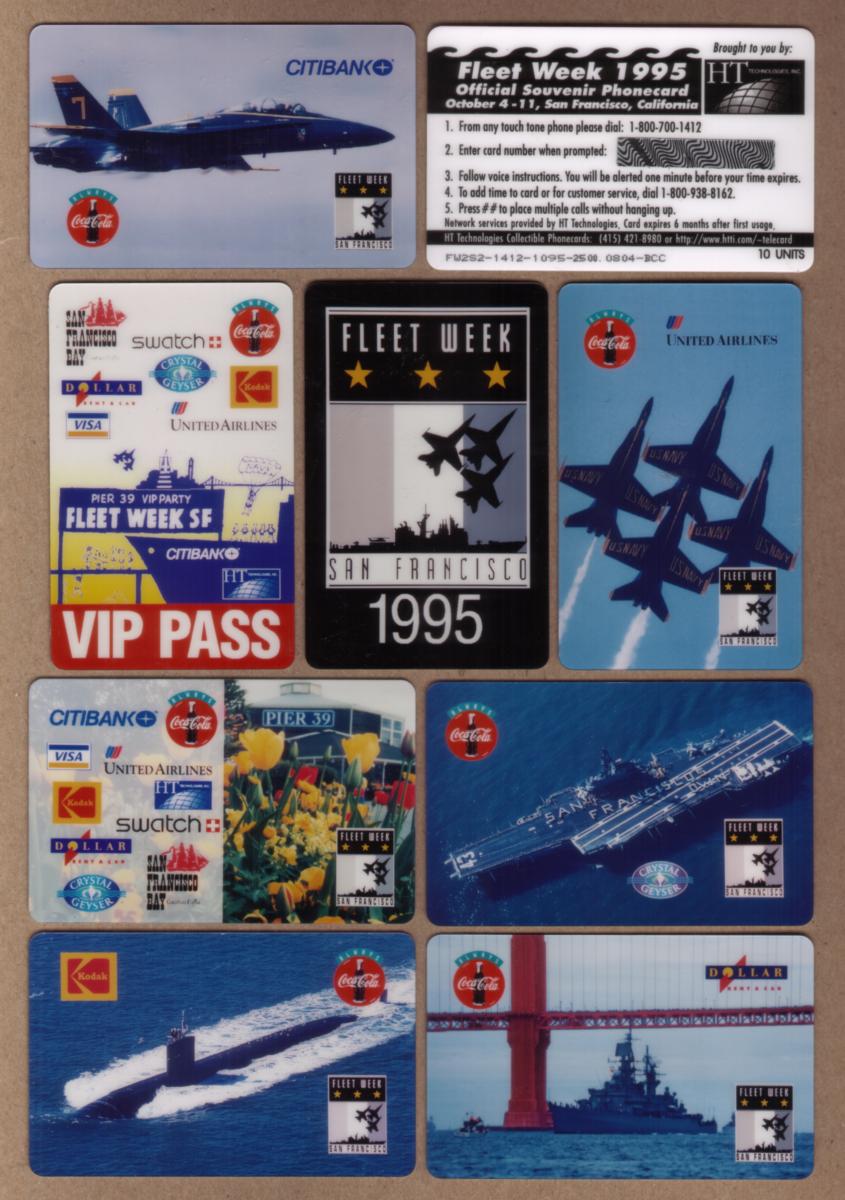 Another card depicts a battleship positioned in front of the Golden Gate Bridge. The Dollar Rent A Car logo is featured in the upper right, with Coca-Cola and Fleet Week San Francisco logos present as well. A fourth card shows four Blue Angels jets flying in formation against a clear blue sky, paired with the United Airlines and Coca-Cola logos alongside the Fleet Week San Francisco emblem. The set also includes a card consisting solely of the Fleet Week San Francisco logo with three stars and the year "1995." One card highlights the VIP Pass for Pier 39’s Fleet Week SF event, showing a blue and yellow design with various logos including San Francisco Bay, Swatch, Kodak, Visa, United Airlines, Coca-Cola, Citibank, Dollar, Crystal Geyser, and HT Technologies.