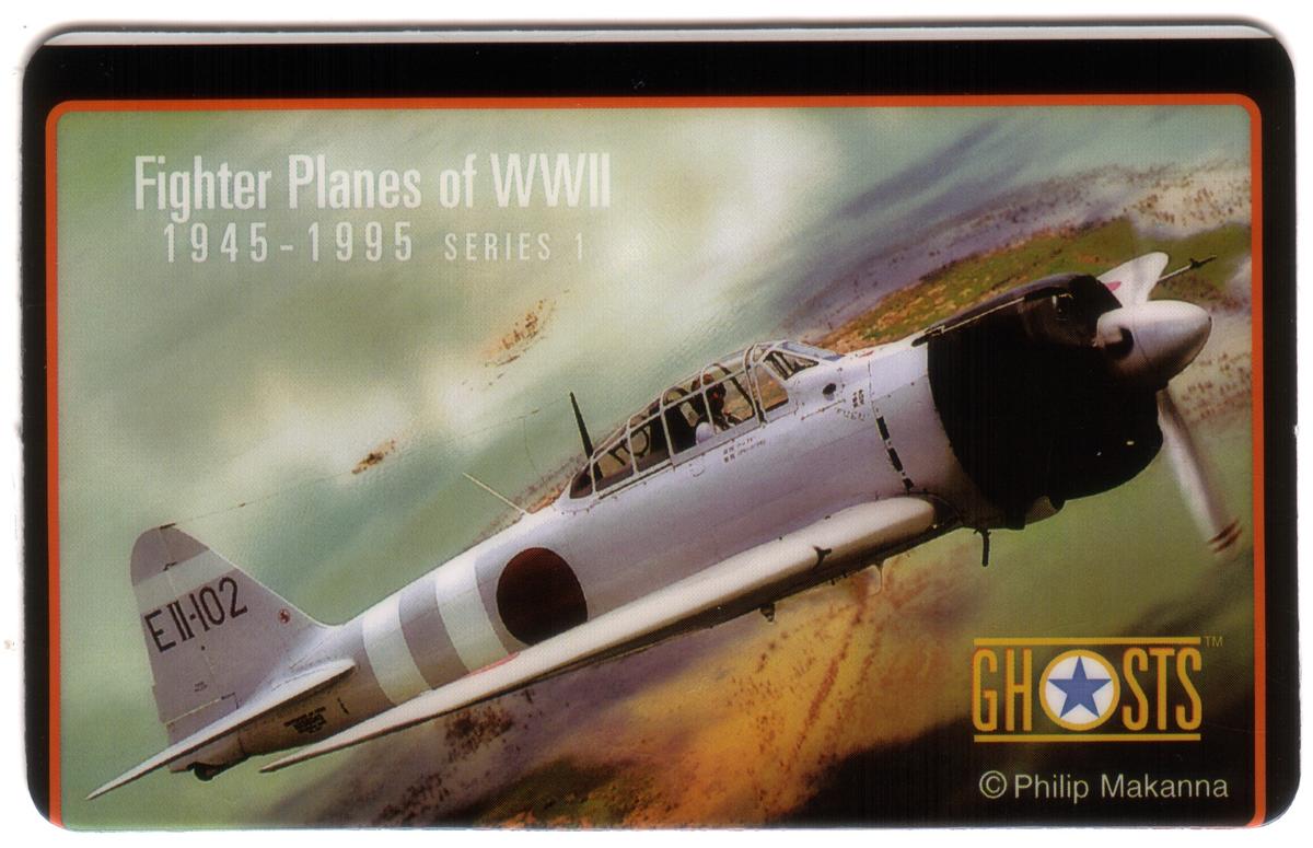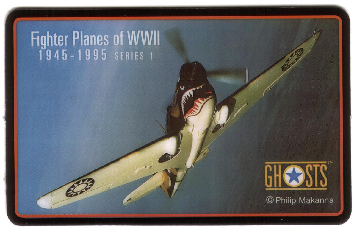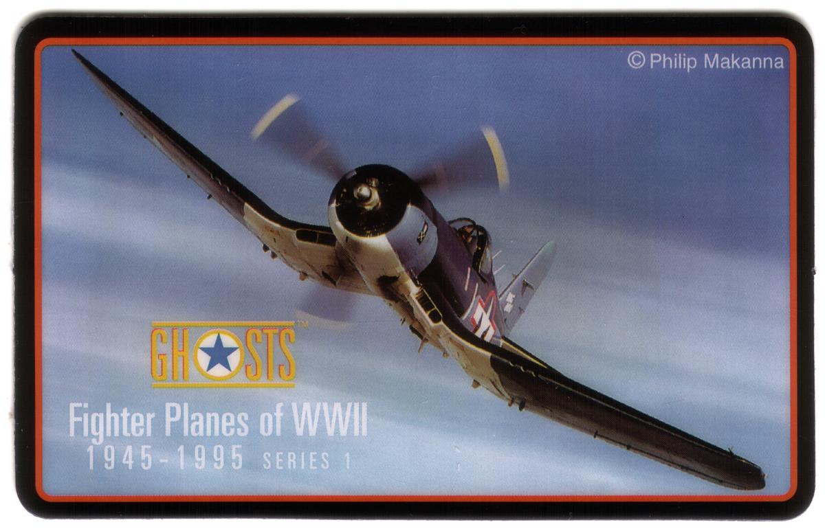 This complete set of six collectible phone cards titled "Ghosts Fighter Planes of WWII 1945-1995 Series 1" features artwork by Philip Makanna, showcasing iconic fighter airplanes from World War II. Each card presents a distinct aircraft image captured in dynamic flight scenes with vivid backgrounds.