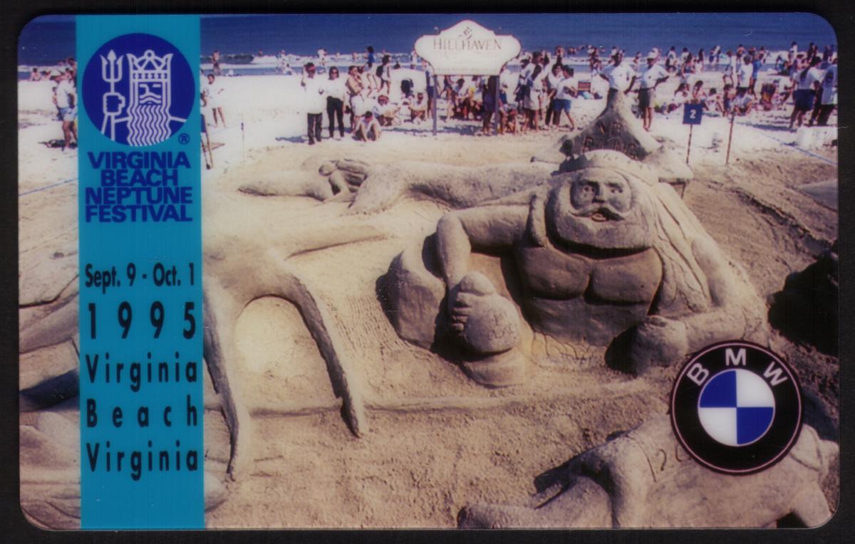 This collectible phone card commemorates the 1995 Neptune Festival held in Virginia Beach, Virginia. The card prominently features an artistic sand sculpture, a hallmark of the Neptune Festival’s beach events, set against a backdrop of sandy beaches and clear blue skies. The sand sculpture depicts a large, intricate design that reflects the festival’s seaside theme. Tree branches partially frame the upper portion of the scene, adding natural detail to the coastal environment.