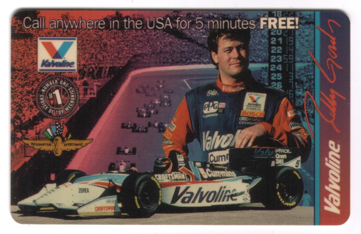 The top of the card includes the text "Call anywhere in the USA for 5 minutes FREE!" The Valvoline logo appears in the upper left corner, alongside the Indianapolis Motor Speedway wing and wheel emblem. The right side of the card has a vertical blue and red stripe with "Valvoline" written in white and Robby Gordon's signature in red.