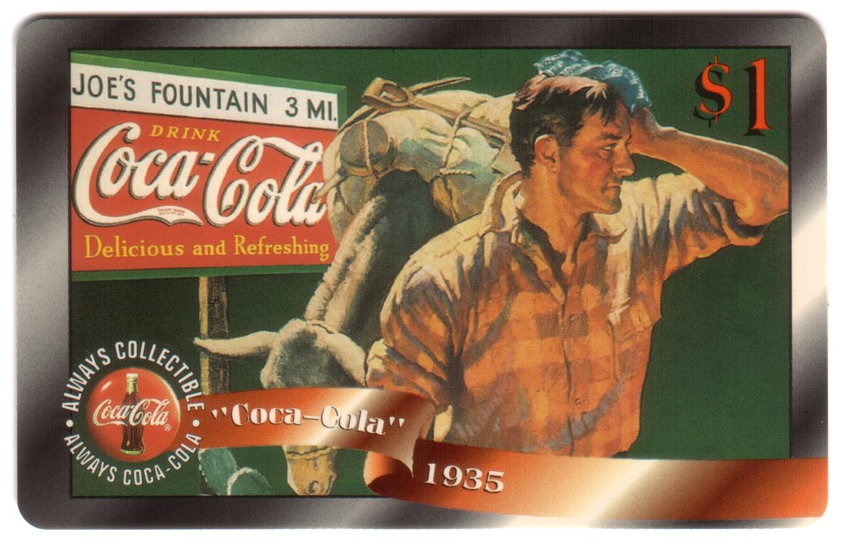 This collectible card features a Coca-Cola theme prominently displaying the Coca-Cola logos and Coke logos. It shows a man with a donkey in a detailed illustration, labeled as "Man With Donkey (1935)." The card is marked as #29 of 48 in the series produced by The Score Board Inc. The card’s value is indicated as $1 and it is linked to the year 1996.
