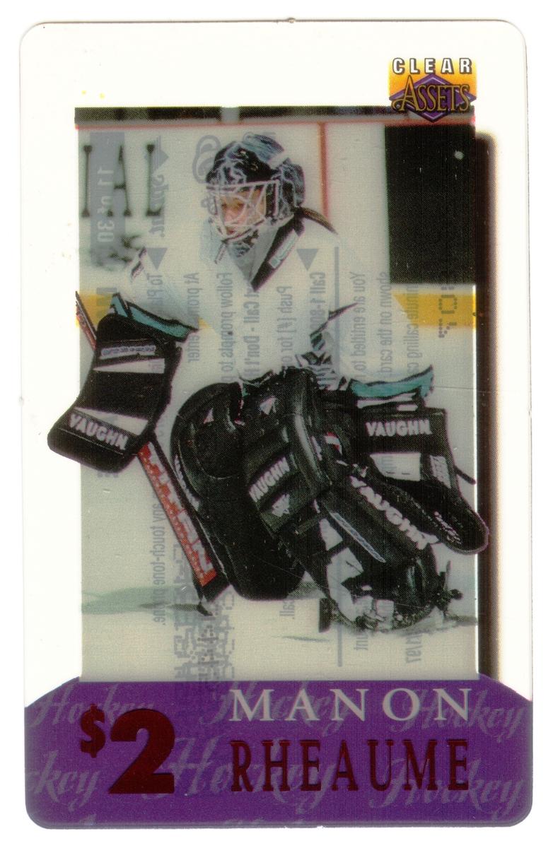 The top portion of the card contains the text "Clear Assets 1996" in reflective silver lettering, followed by "$2" on the right side, indicating the card’s value. Near the bottom-left corner, the card displays "Manon Rheaume" in red lettering with a white outline, and beneath it, in smaller lettering, "Card #11 of 30." The lower edge of the card shows the name "The Score Board Inc." in white text on a black strip.