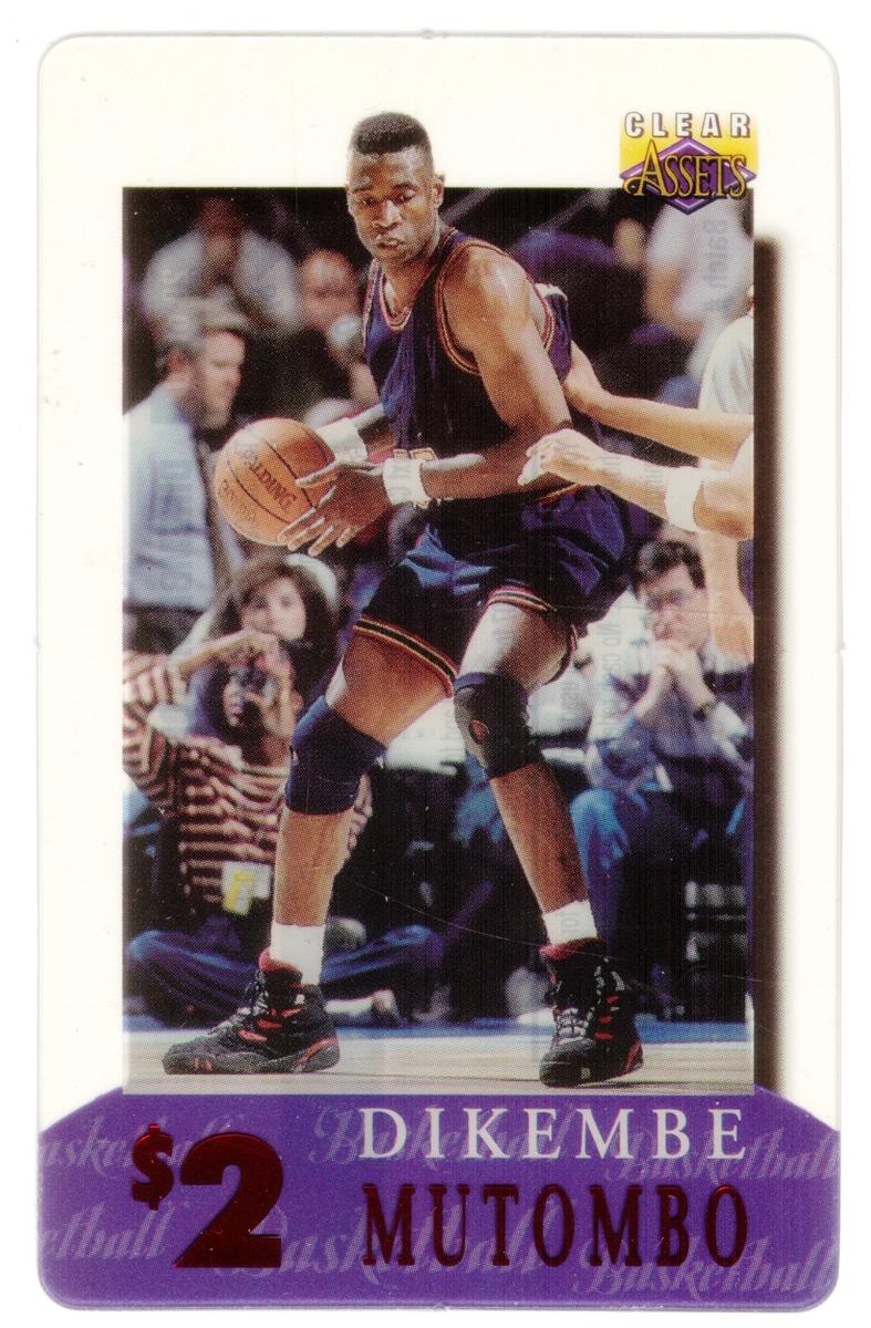 This collectible card features Dikembe Mutombo, a professional basketball player known for his NBA career. The card is from the "Clear Assets 1996" series produced by The Score Board Inc. It is numbered 20 out of a set of 30 cards. Dikembe Mutombo's name is printed clearly on the card, along with the indication of the $2 value. The card shows a visual design associated with basketball and the National Basketball Association (NBA).