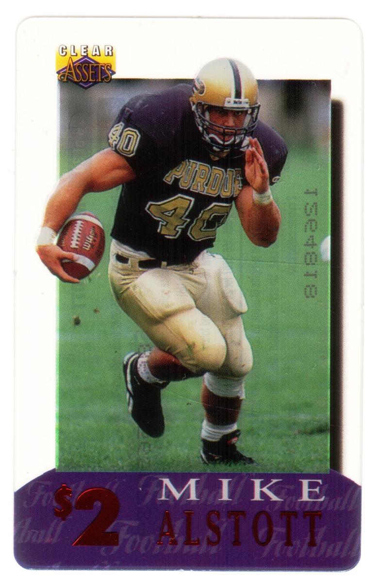 This collectible card features Mike Alstott, a football player who played in the National Football League (NFL). The card is numbered 23 out of a set of 30 and was produced in 1996 by The Score Board Inc. It belongs to the Clear Assets series and has a stated value of $2. The design prominently includes the name "Mike Alstott" in uppercase letters and the NFL logo, linking it directly to professional American football.